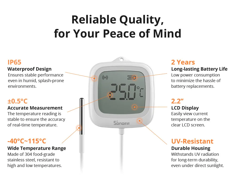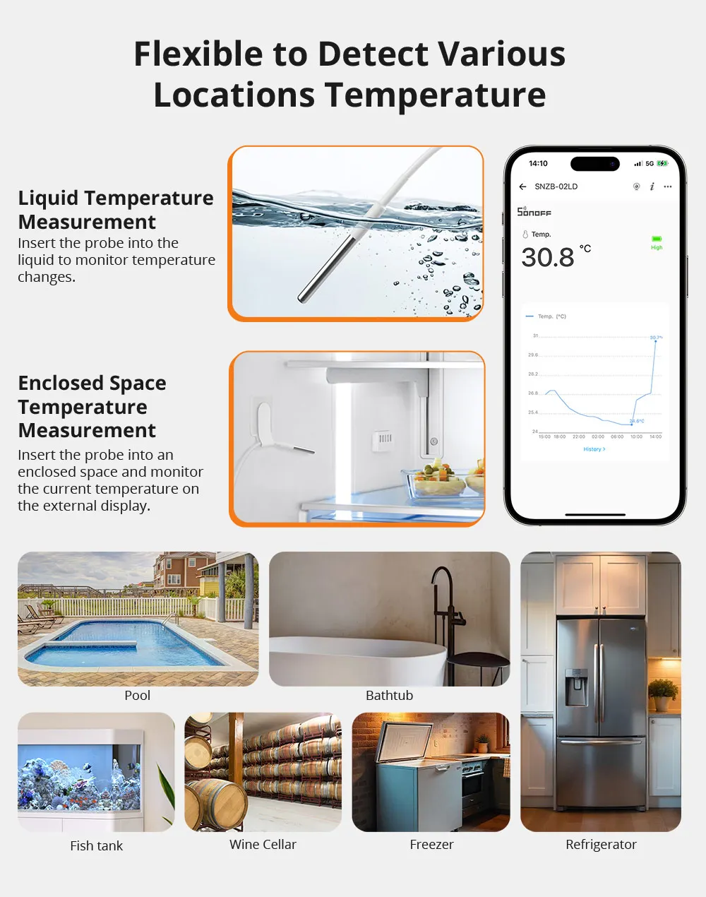 Take your temperature monitoring to the next level with the SONOFF SNZB-02LD Smart LCD Thermometer—a versatile solution designed for both indoor and outdoor environments like pools, refrigerators, bathtubs, freezers, or greenhouse setups.