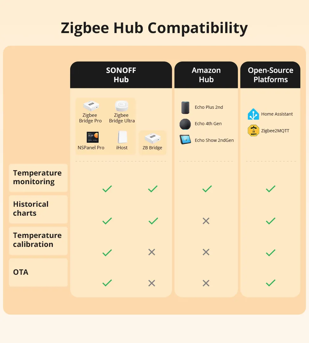 ✔️ Broad Compatibility — Works with SONOFF ZBDongle series, Echo devices, and open-source platforms like Home Assistant