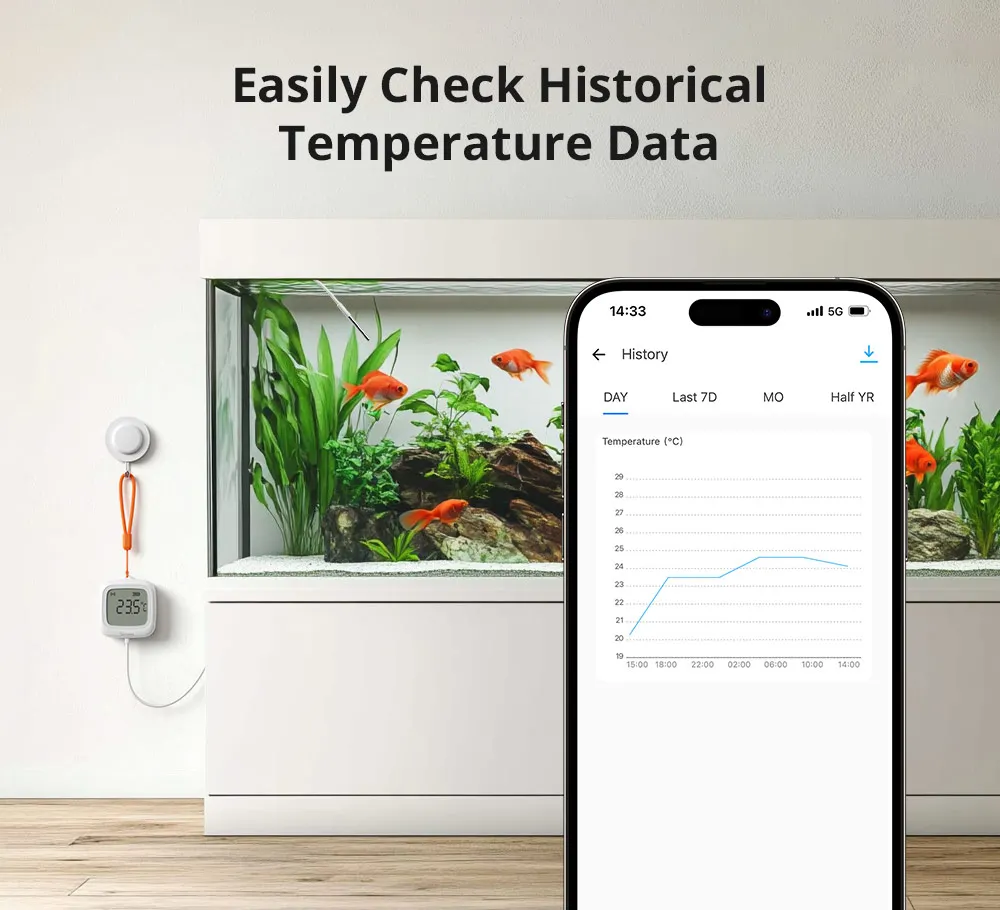 The eWeLink app allows you to view temperature data by day, month, or over the past half year, with a storage capacity of up to 180 days. You can access or export historical temperature charts, helping you better plan your water tank temperature.