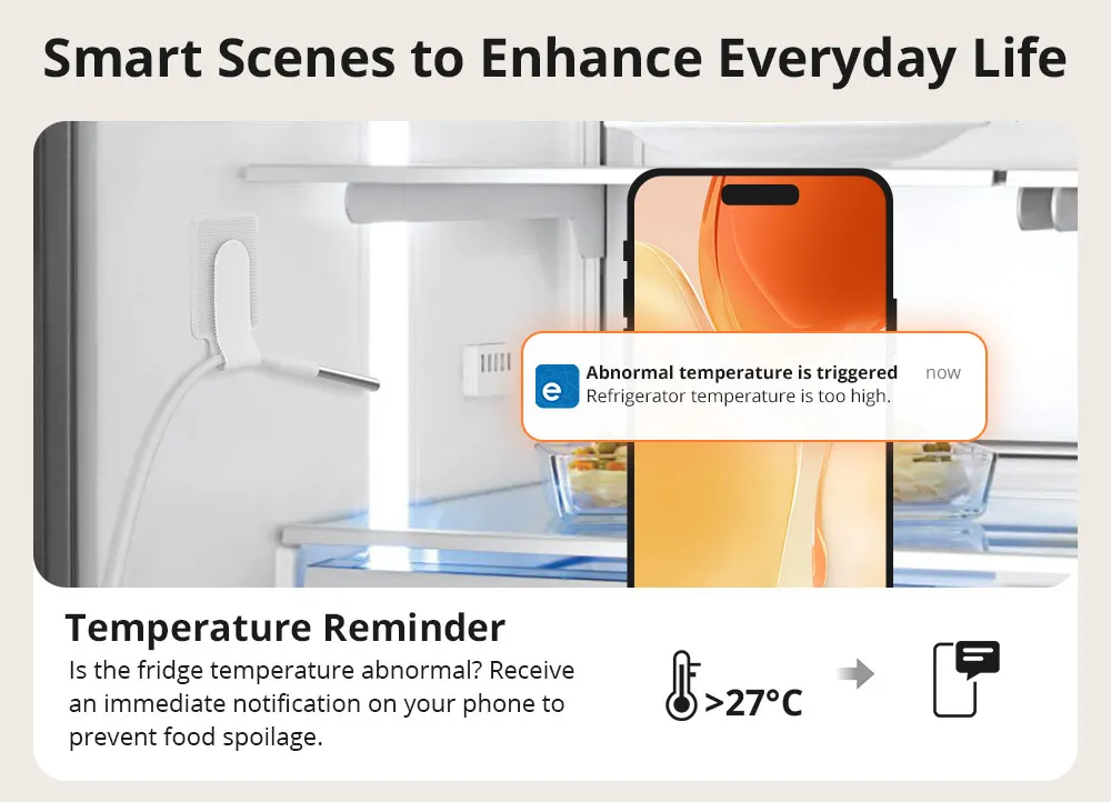 Create smart scenes through the eWeLink app, receive notifications for abnormal temperatures, or set up automation based on temperature changes.